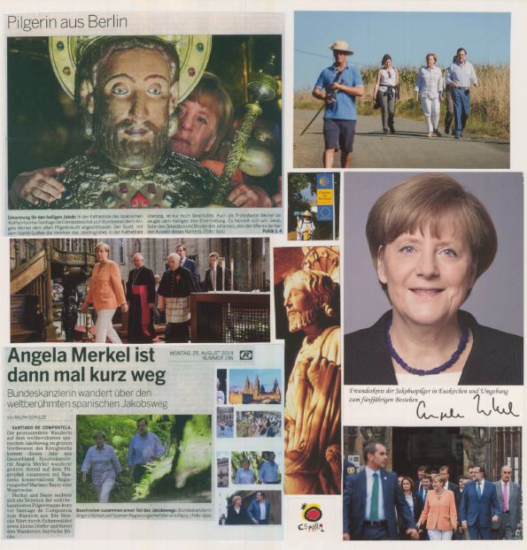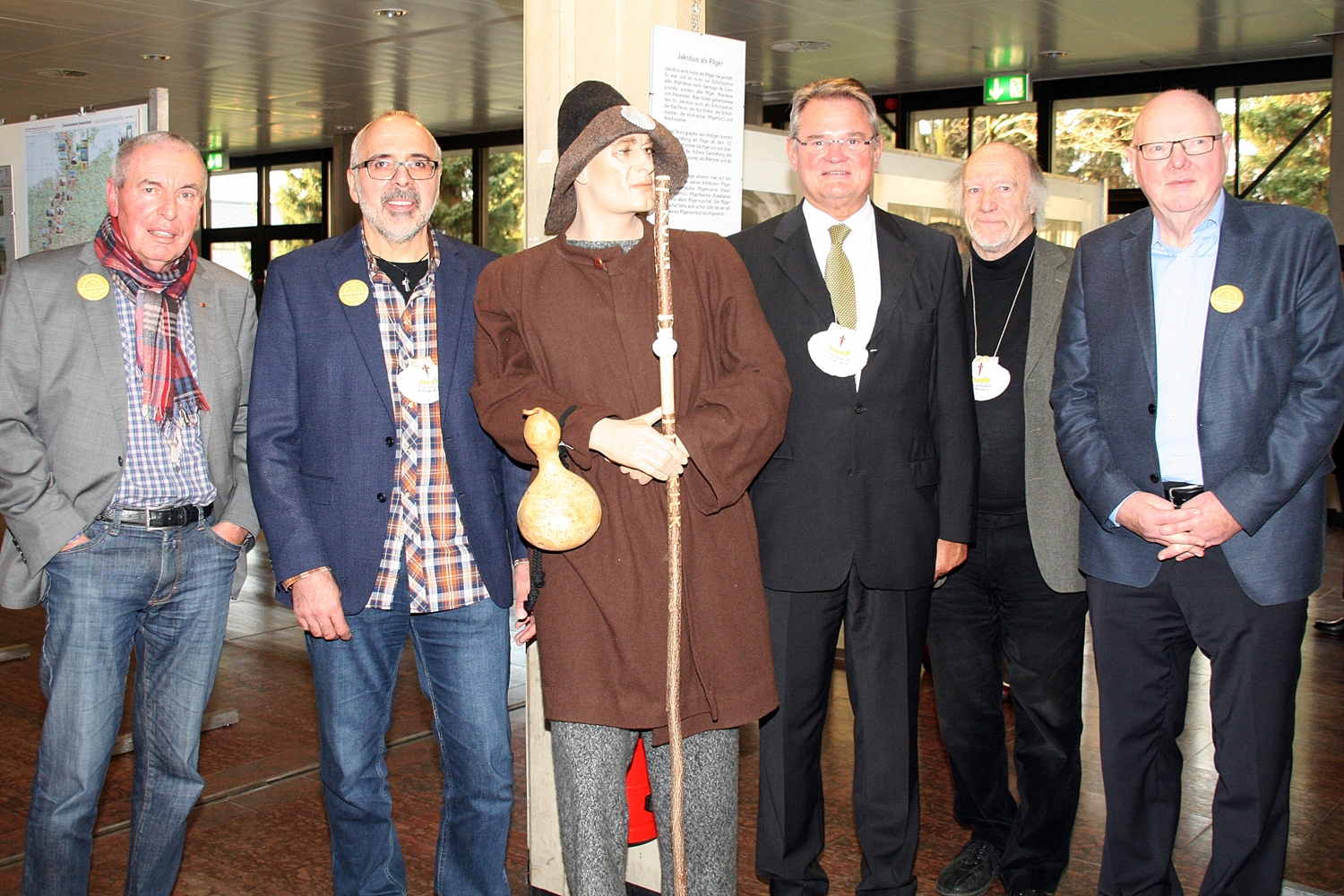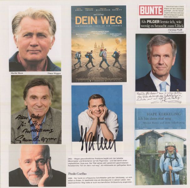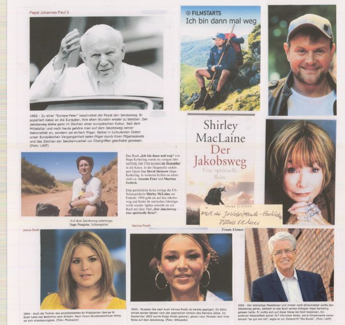 Ein Abschnitt der Ausstellung widmet sich „prominenten“ Pilgern auf dem Jakobsweg. Post dazu mit Beiträgen für die Ausstellung erhielten die Euskirchener bei ihren Vorbereitungen unter anderem aus dem spanischen Königspalast, aus dem Bundeskanzleramt und von Fußball-Weltmeister Wolfgang Overath („Diesen Weg muss jeder einmal in seinem Leben gehen.“), der im Jahr 2009 auf dem Jakobsweg unterwegs war. Unter dem Motto „Im Spiegel der Presse“ werden Presseberichte aus dem Kreis dokumentiert. Auch zahlreiche Fotos des Projekts „Auf Jakobswegen quer durch Deutschland“ sind zu sehen.
